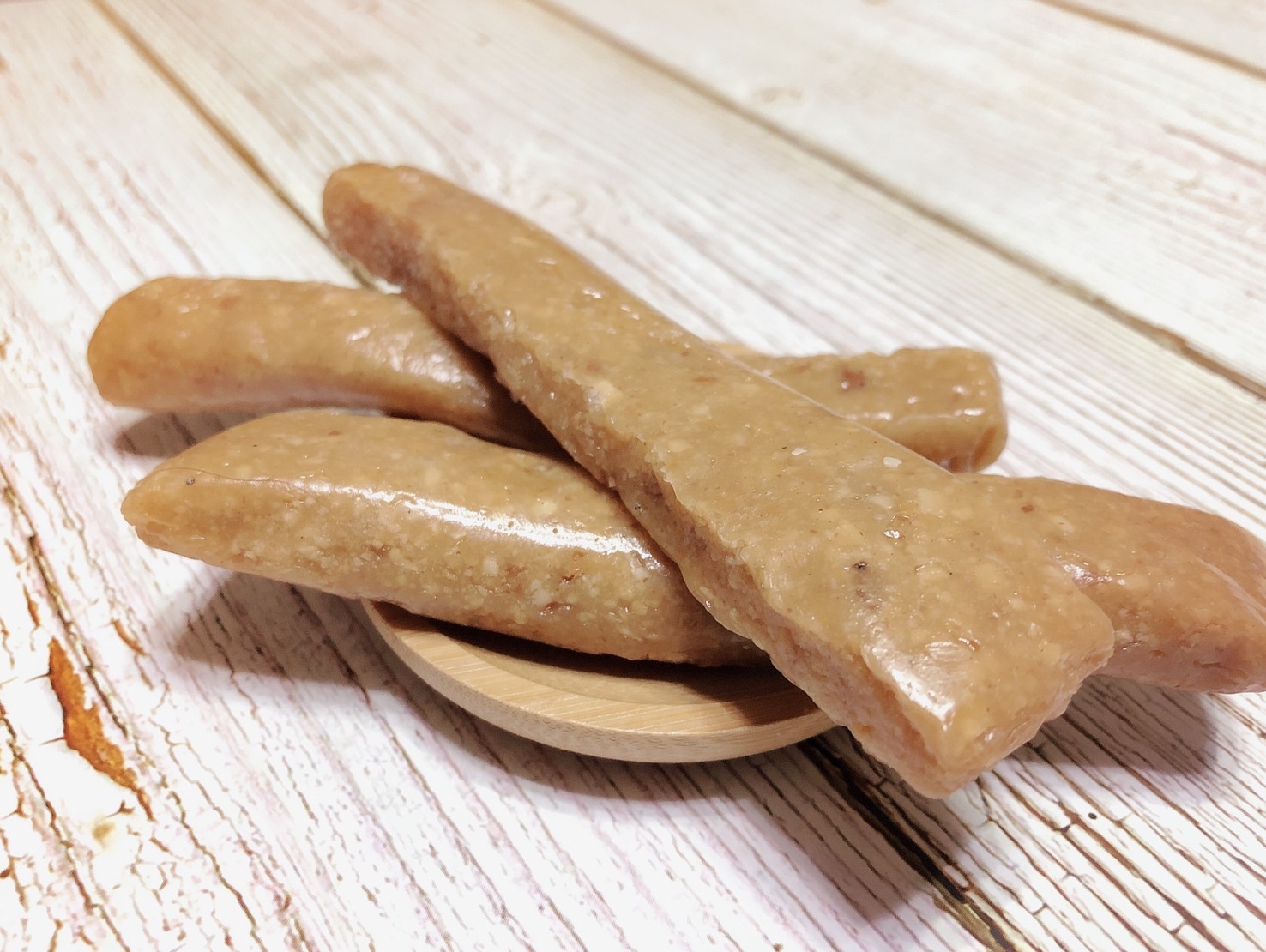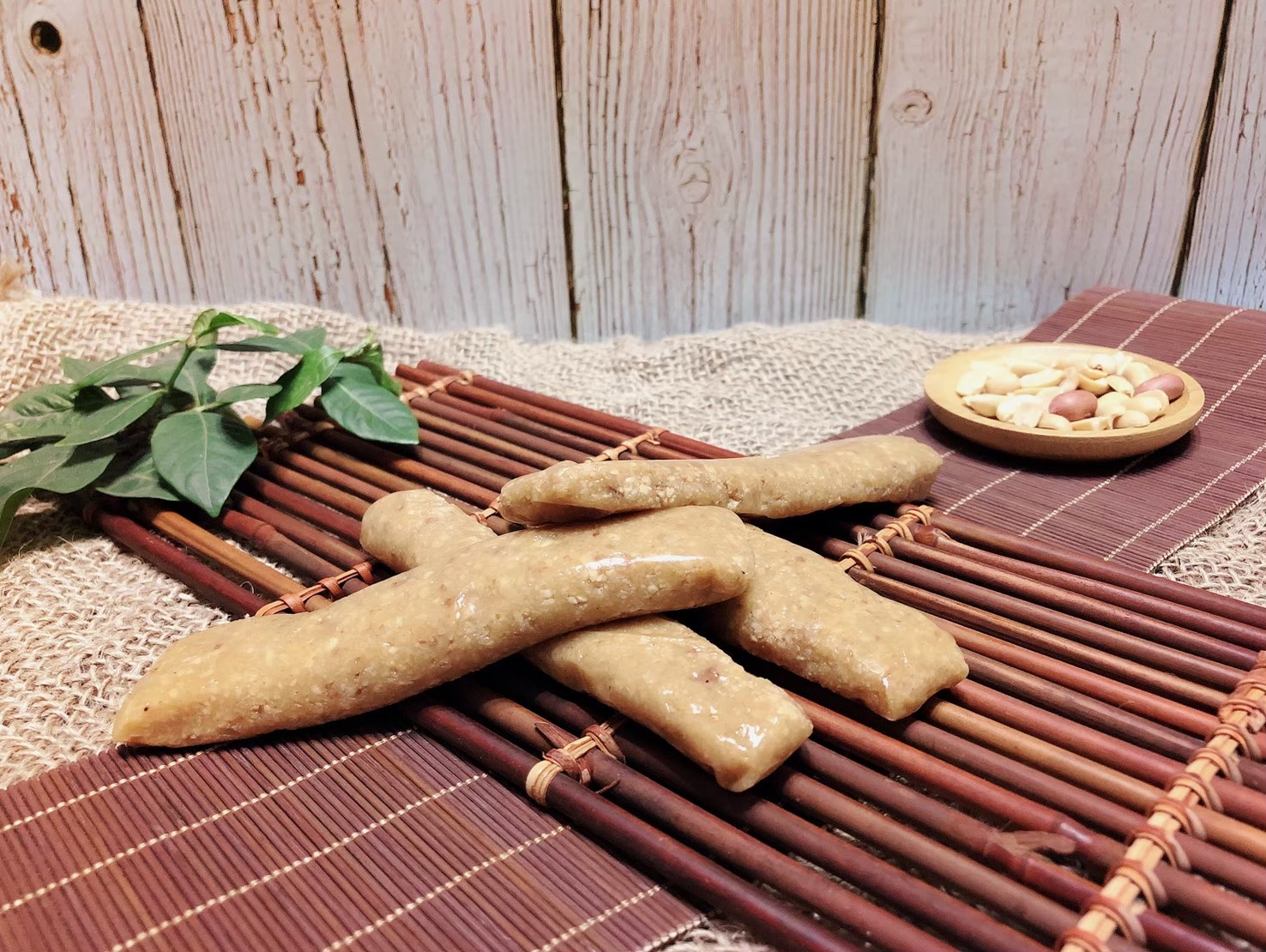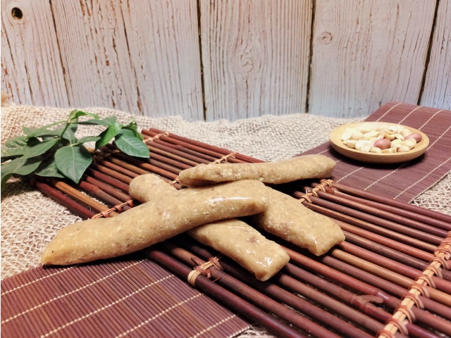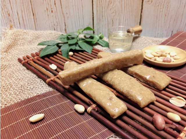 花生軟糖外有沾附著芝麻的麥芽Q糖皮,內餡為土豆與青豆依秘傳比例混合而成。